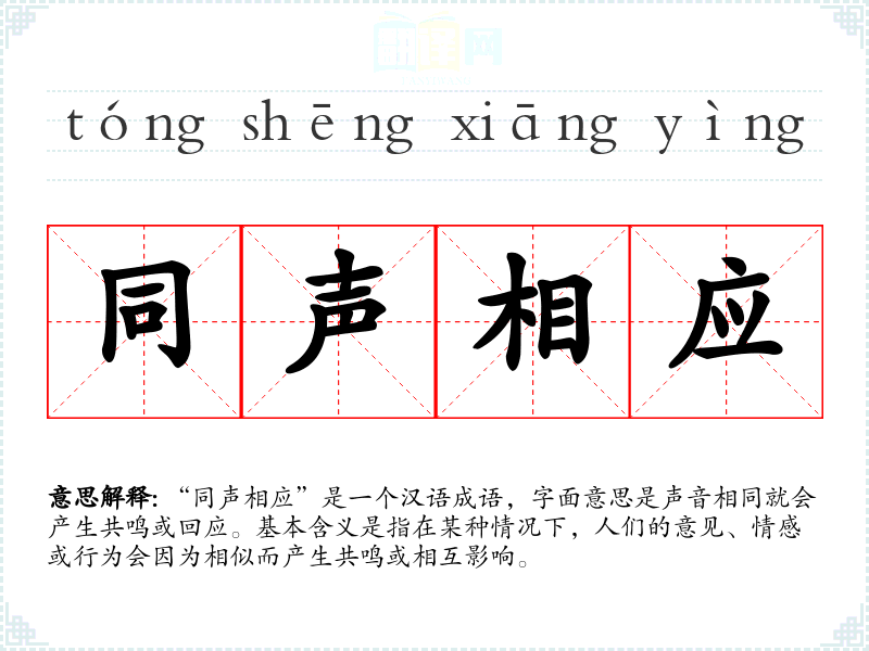 “同声相应”是一个汉语成语,字面意思是声音相同就会产生共鸣或回应。基本含义是指在某种情况下,人们的意见、情感或行为会因为相似而产生共鸣或相互影响。