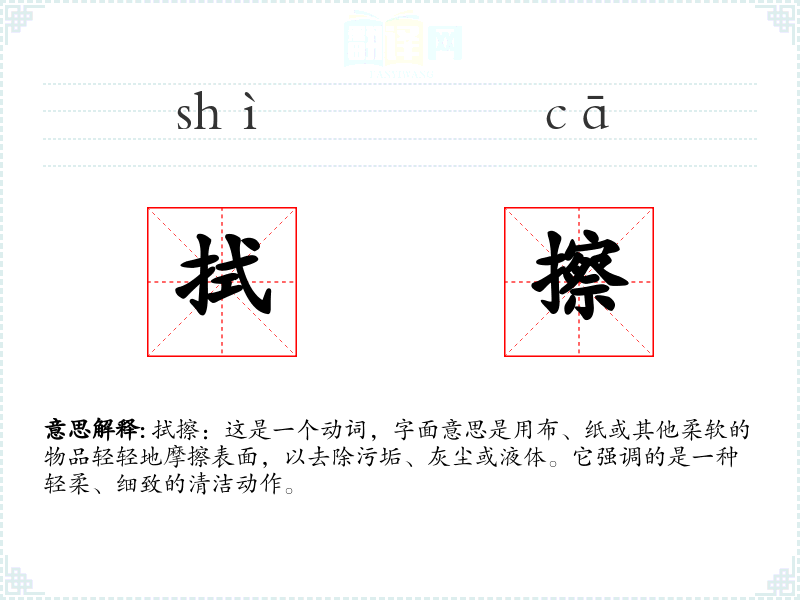拭擦:这是一个动词,字面意思是用布、纸或其他柔软的物品轻轻地摩擦表面,以去除污垢、灰尘或液体。它强调的是一种轻柔、细致的清洁动作。