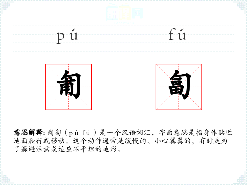匍匐(pú fú)是一个汉语词汇,字面意思是指身体贴近地面爬行或移动。这个动作通常是缓慢的、小心翼翼的,有时是为了躲避注意或适应不平坦的地形。