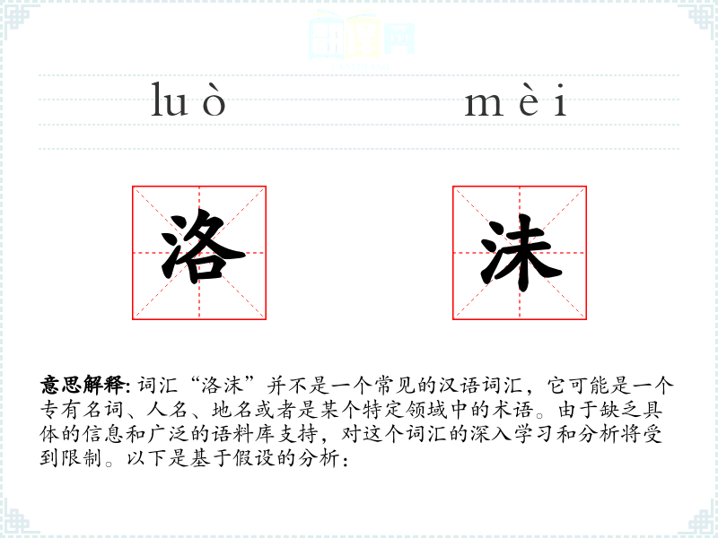 由于“洛沫”不是一个标准词汇,我们无法提供一个确切的基本定义。它可能是由“洛”和“沫”两个字组合而成的,其中“洛”可能指代洛河、洛阳等地名,而“沫”通常指液体的小泡沫。