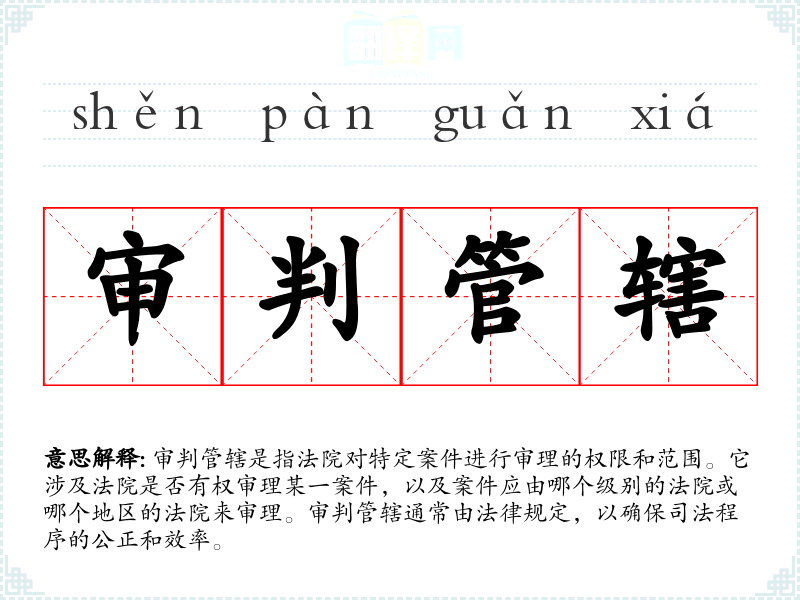审判管辖是法律体系中的一个基础概念,对于确保司法程序的公正和效率至关重要。了解这一概念不仅有助于理解法律程序,还能在处理法律事务时做出更明智的决策。在语言学习和表达中,掌握这一词汇及其相关概念对于深入理解法律文化和实践具有重要意义。