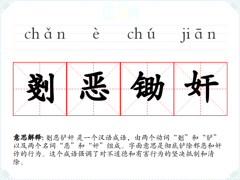 剗恶铲奸 是一个汉语成语,由两个动词“剗”和“铲”以及两个名词“恶”和“奸”组成。字面意思是彻底铲除邪恶和奸诈的行为。这个成语强调了对不道德和有害行为的坚决抵制和清除。