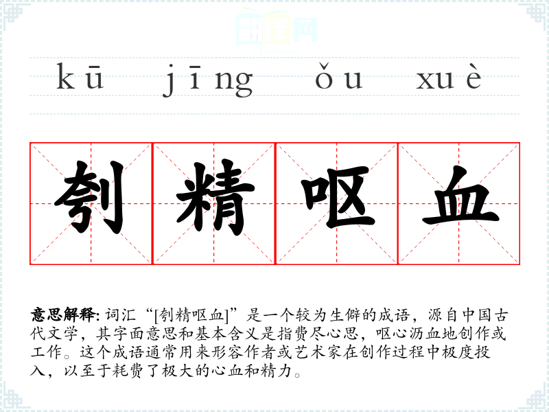 词汇“[刳精呕血]”是一个较为生僻的成语,源自**古代文学,其字面意思和基本含义是指费尽心思,呕心沥血地创作或工作。这个成语通常用来形容作者或艺术家在创作过程中极度投入,以至于耗费了极大的心血和精力。