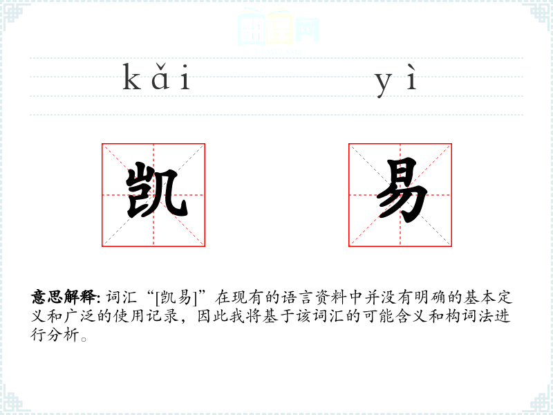 由于“[凯易]”不是一个常见的词汇,我们无法给出确切的基本定义。但从字面上看,“凯”可能与胜利、成功有关,而“易”则可能表示容易、简单。结合起来,“[凯易]”可能意味着“容易取得胜利”或“成功轻而易举”。