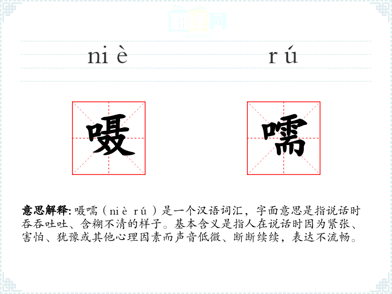 嗫嚅(niè rú)是一个汉语词汇,字面意思是指说话时吞吞吐吐、含糊不清的样子。基本含义是指人在说话时因为紧张、害怕、犹豫或其他心理因素而声音低微、断断续续,表达不流畅。