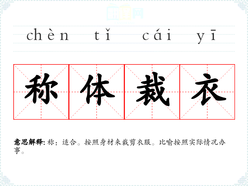 称:适合。按照身材来裁剪衣服。比喻按照实际情况办事。