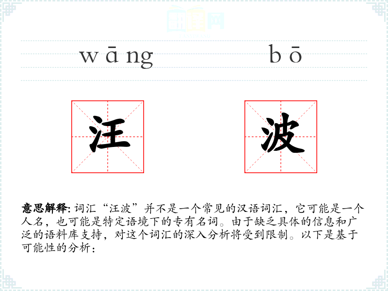 由于“汪波”不是一个常见的词汇,以上的分析更多是基于假设和可能性。如果“汪波”有特定的背景或含义,需要更多的信息来进行准确的分析。