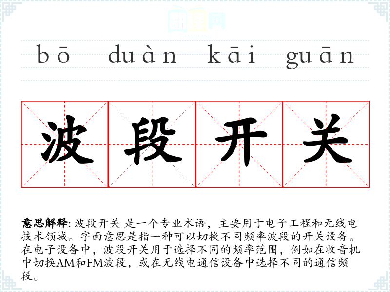 在不同语言中,波段开关的翻译可能有所不同,但其功能和用途基本一致。例如,在英语中称为 "band switch"。