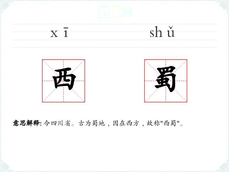 今四川省。古为蜀地﹐因在西方﹐故称"西蜀"。