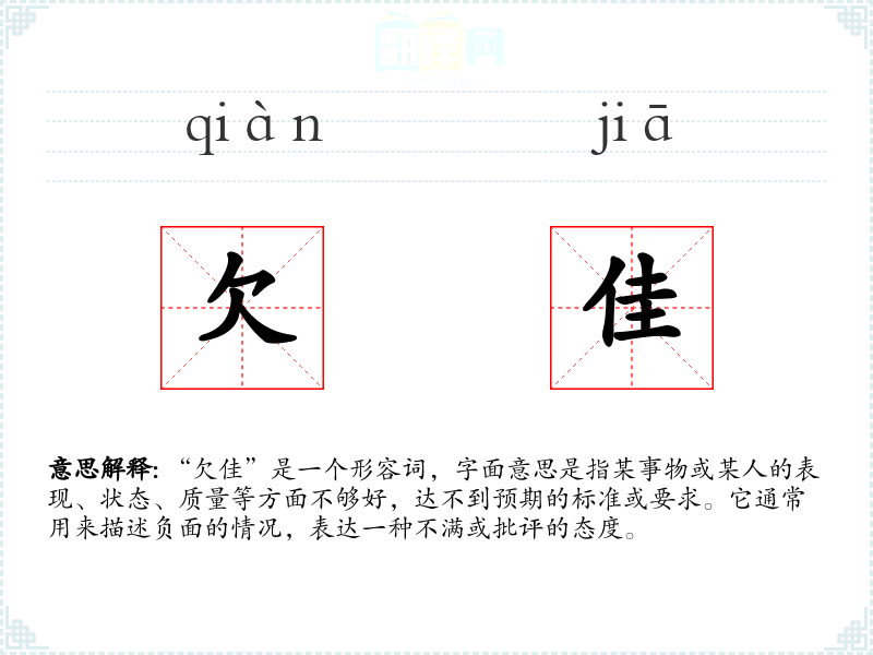 “欠佳”由“欠”和“佳”两个字组成。“欠”字有不足、缺乏的意思,“佳”字则表示好、优秀。两个字结合,形成了表示不够好的意思。在古代汉语中,“欠”字常用于表示债务,而“佳”字则用于形容美好的事物。随着语言的发展,这两个字的组合逐渐形成了现代汉语中的“欠佳”。