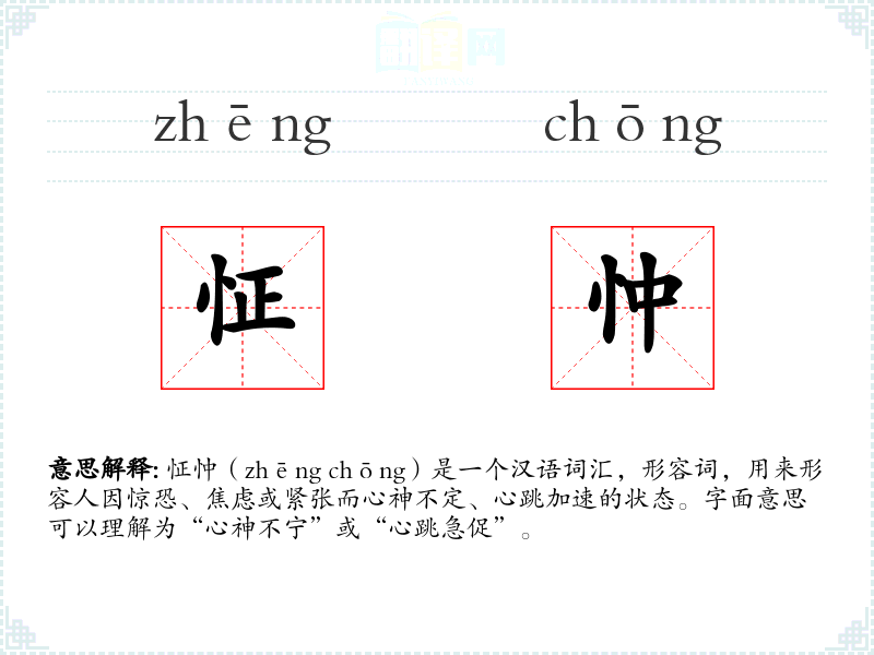 怔忡(zhēng chōng)是一个汉语词汇,形容词,用来形容人因惊恐、焦虑或紧张而心神不定、心跳加速的状态。字面意思可以理解为“心神不宁”或“心跳急促”。