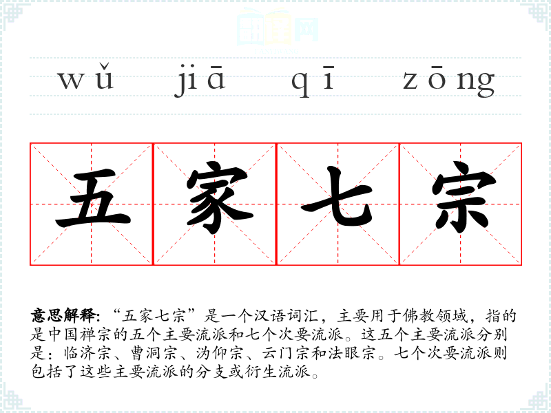 “五家七宗”是一个汉语词汇,主要用于领域,指的是禅宗的五个主要流派和七个次要流派。这五个主要流派分别是:临济宗、曹洞宗、沩仰宗、云门宗和法眼宗。七个次要流派则包括了这些主要流派的分支或衍生流派。