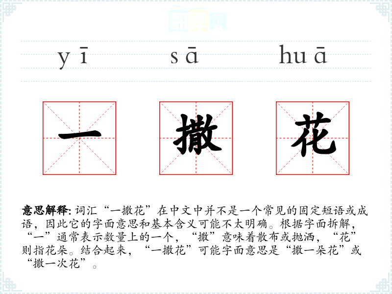 - 反义词:(由于“一撒花”不是一个常用词汇,反义词可能不明显)