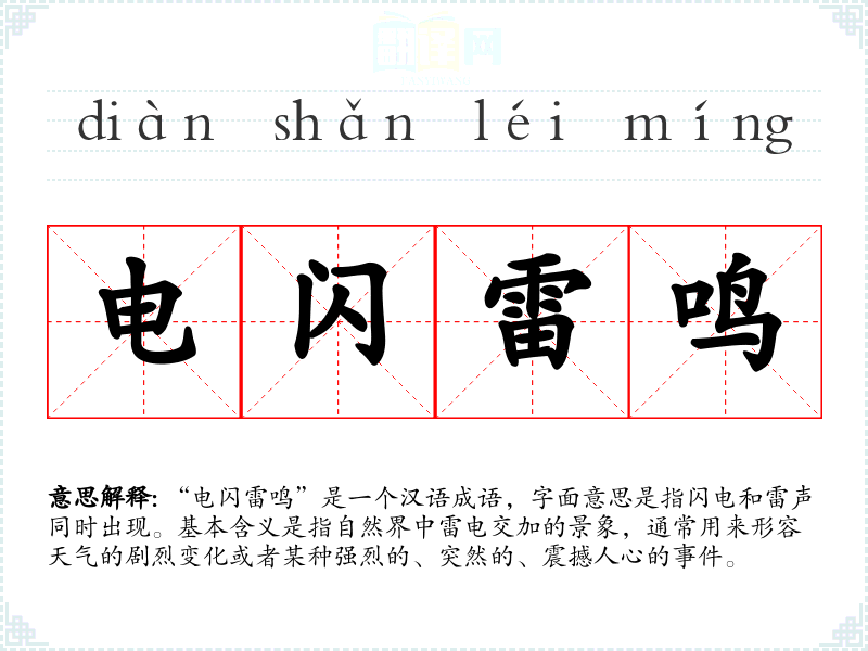 “电闪雷鸣”是一个汉语成语,字面意思是指闪电和雷声同时出现。基本含义是指自然界中雷电交加的景象,通常用来形容天气的剧烈变化或者某种强烈的、突然的、震撼人心的**。