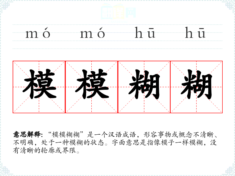 “模模糊糊”是一个汉语成语,形容事物或概念不清晰、不明确,处于一种模糊的状态。字面意思是指像模子一样模糊,没有清晰的轮廓或界限。