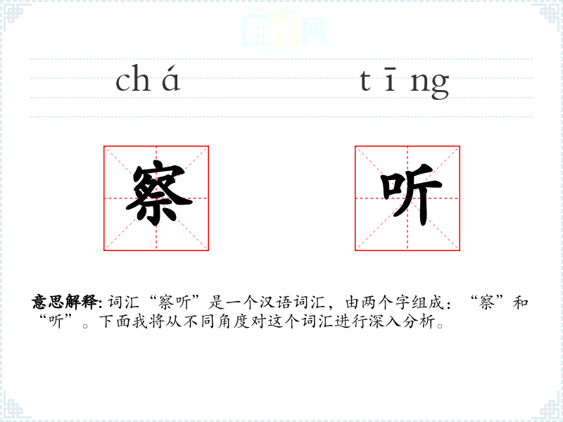 “察”字源自古代汉语,意为仔细看、调查;“听”字则指用耳朵接收声音。两者结合,形成了“察听”这一复合词,强调的是一种综合的感知方式。