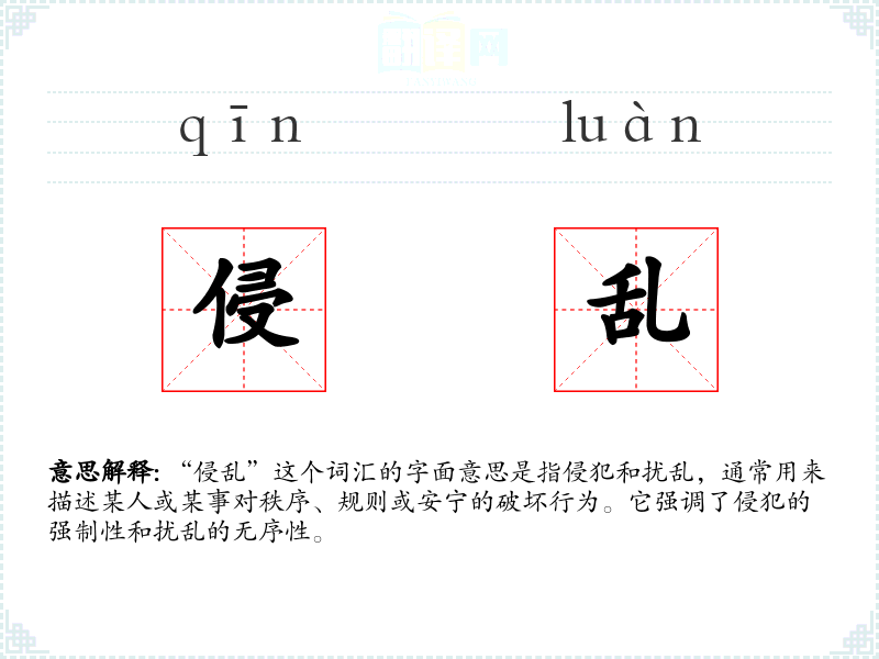 “侵乱”由“侵”和“乱”两个字组成,“侵”字古已有之,意为侵犯、侵入,“乱”字则表示无序、混乱。这两个字组合起来,强调了侵犯行为带来的混乱状态。