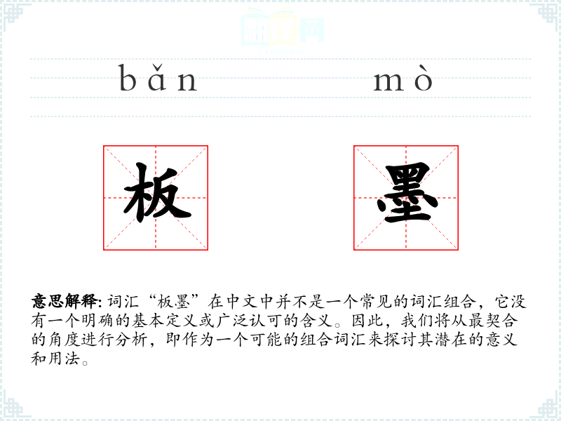 由于“板墨”不是一个标准词汇,我们可以推测它可能是由两个字“板”和“墨”组合而成的。在中文中,“板”通常指平板或硬质的表面,如木板、黑板等;“墨”则通常指用于书写的墨水或墨汁。结合起来,“板墨”可能指的是用于书写的平板和墨水,或者是在平板上书写的动作。