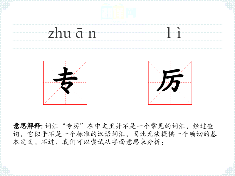- 由于“专厉”不是一个标准词汇,它在不同语境下的使用可能非常有限,或者可能只在某些特定的行业或社群中使用。