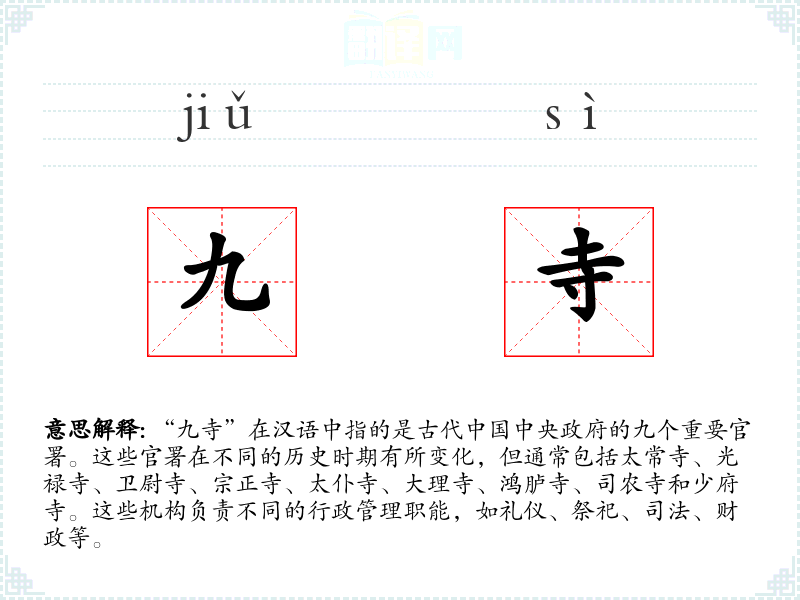 “九寺”在汉语中指的是古代**中央政府的九个重要官署。这些官署在不同的历史时期有所变化,但通常包括太常寺、光禄寺、卫尉寺、宗正寺、太仆寺、大理寺、鸿胪寺、司农寺和少府寺。这些机构负责不同的行政管理职能,如礼仪、祭祀、司法、财政等。