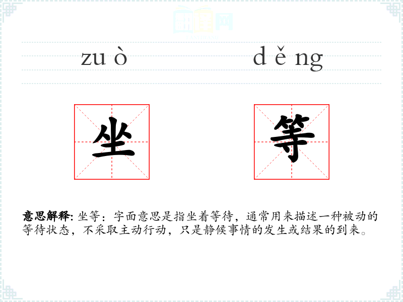 坐等:字面意思是指坐着等待,通常用来描述一种被动的等待状态,不采取主动行动,只是静候事情的发生或结果的到来。