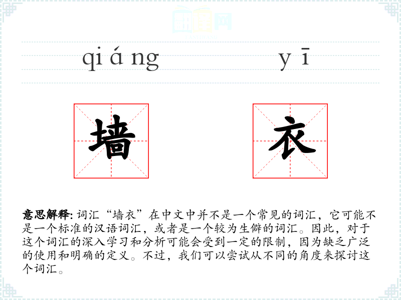 词汇“墙衣”在中文中并不是一个常见的词汇,它可能不是一个标准的汉语词汇,或者是一个较为生僻的词汇。因此,对于这个词汇的深入学习和分析可能会受到一定的限制,因为缺乏广泛的使用和明确的定义。不过,我们可以尝试从不同的角度来探讨这个词汇。