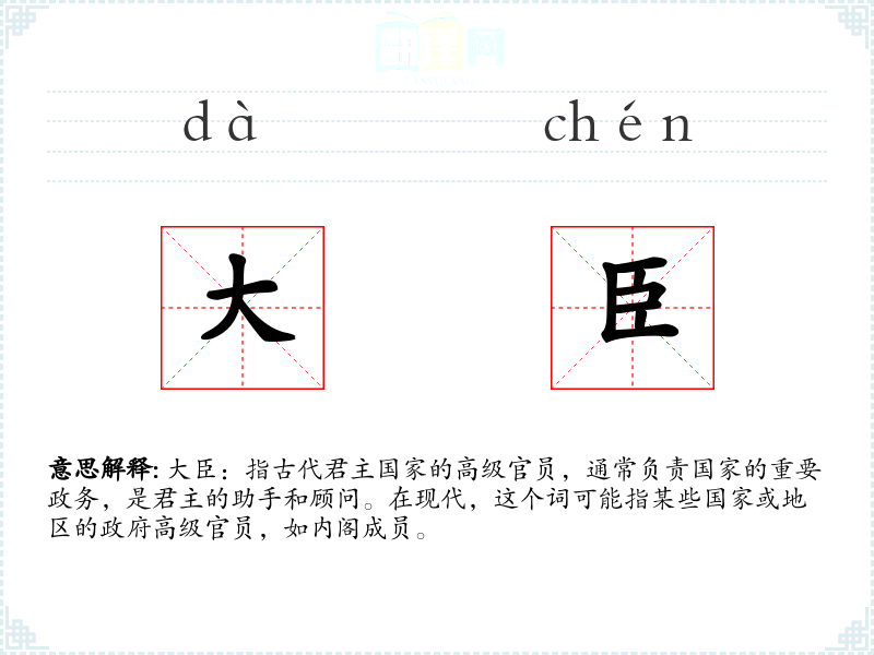 大臣:指古代君主国家的高级官员,通常负责国家的重要政务,是君主的助手和顾问。在现代,这个词可能指某些国家或地区的政府高级官员,如内阁成员。