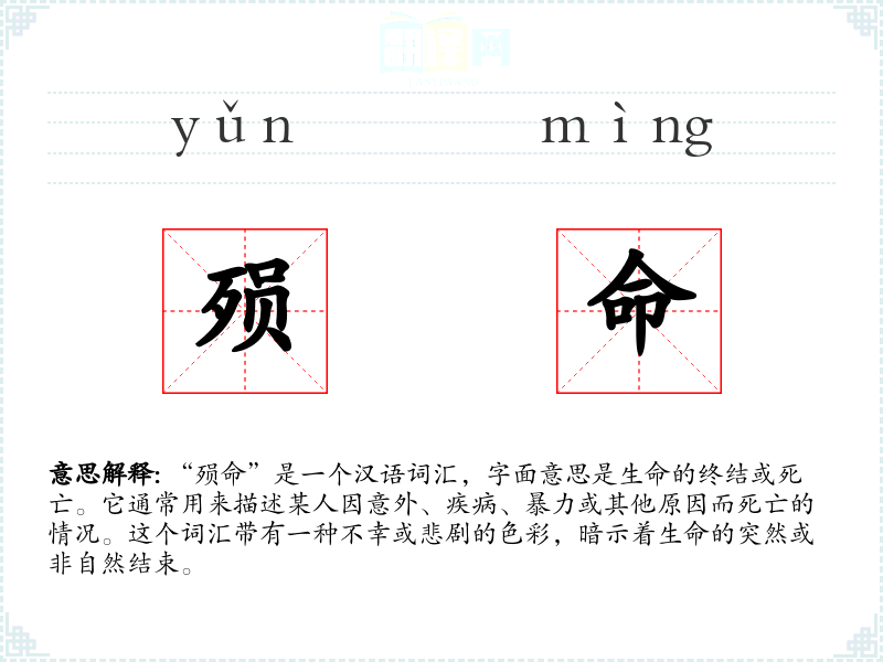 “殒命”是一个汉语词汇,字面意思是生命的终结或死亡。它通常用来描述某人因意外、疾病、暴力或其他原因而死亡的情况。这个词汇带有一种不幸或悲剧的色彩,暗示着生命的突然或非自然结束。