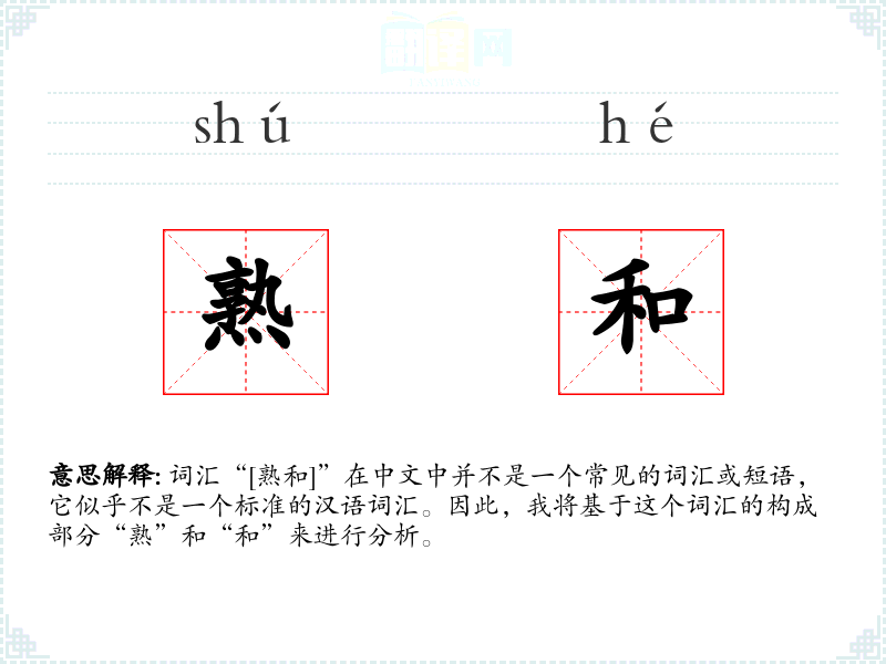 - 在英语中,“熟”可以对应为“familiar”或“acquainted”,“和”可以对应为“harmony”或“peaceful”。
