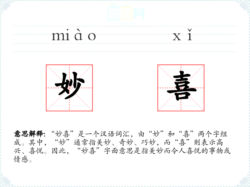 “妙喜”这个词让我联想到清晨的鸟鸣和花朵的绽放,带来一种清新和生机勃勃的视觉和听觉体验。