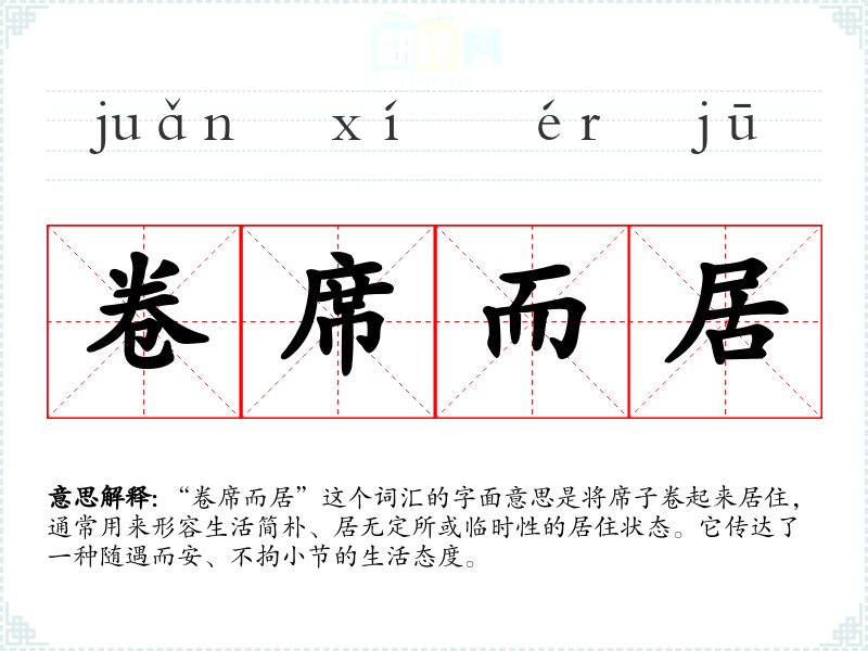 “卷席而居”这个词汇的字面意思是将席子卷起来居住,通常用来形容生活简朴、居无定所或临时性的居住状态。它传达了一种随遇而安、不拘小节的生活态度。