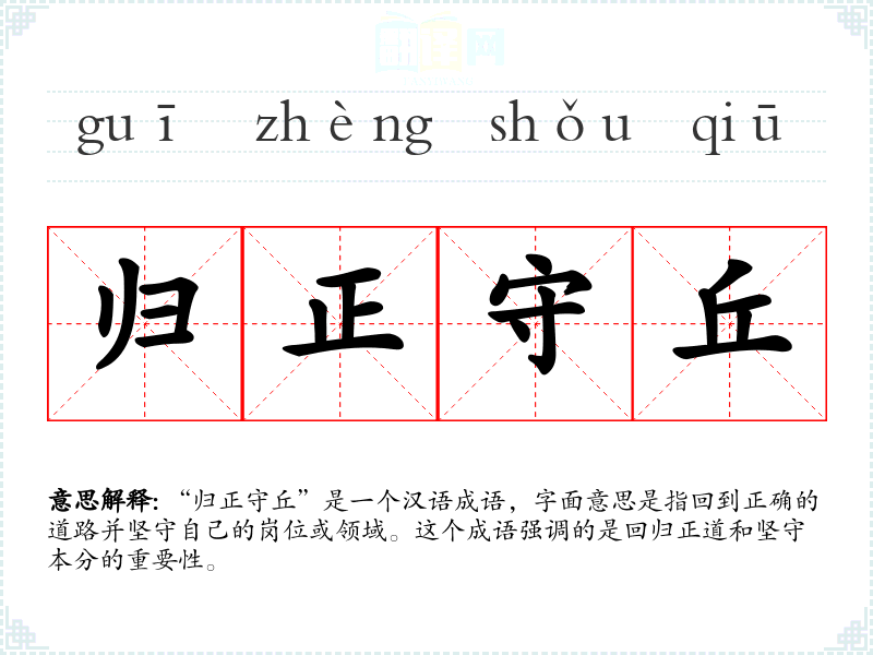 “归正守丘”是一个汉语成语,字面意思是指回到正确的道路并坚守自己的岗位或领域。这个成语强调的是回归正道和坚守本分的重要性。