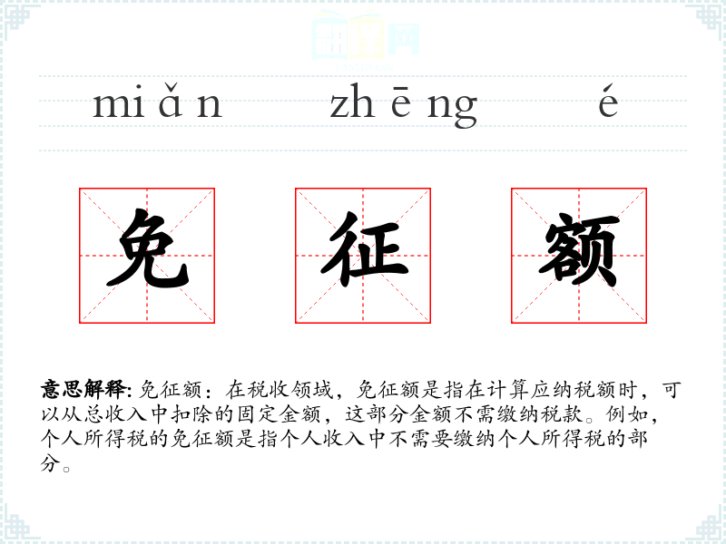 文学:在文学作品中,免征额可能作为一个专业术语出现,用于描述税收政策对个人或家庭经济的影响。 口语:在日常对话中,人们可能会讨论免征额的变化对个人财务的影响,尤其是在税收政策调整时。 专业领域:在会计、税务等专业领域,免征额是一个核心概念,用于计算应纳税额。
