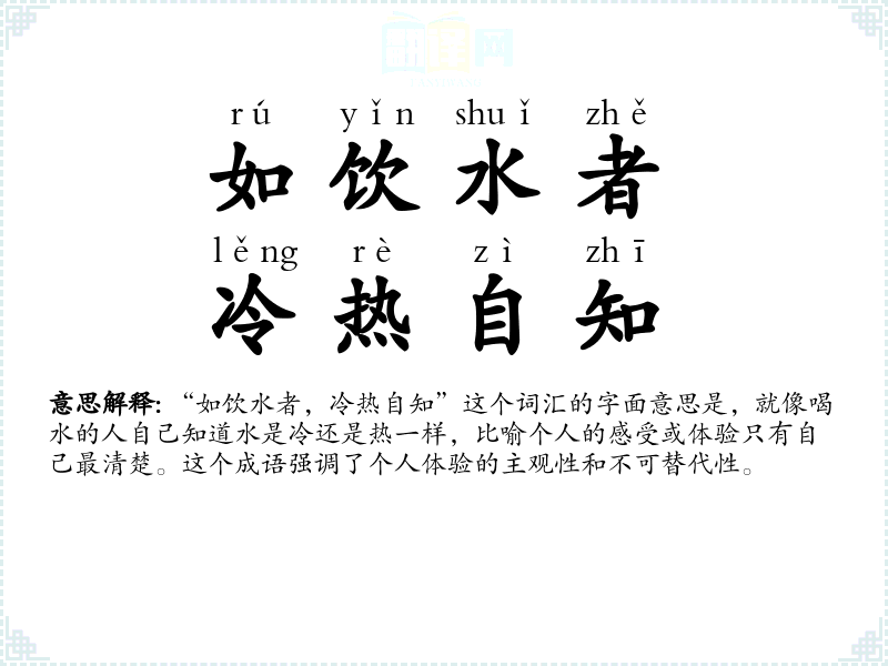 “如饮水者,冷热自知”这个词汇的字面意思是,就像喝水的人自己知道水是冷还是热一样,比喻个人的感受或体验只有自己最清楚。这个成语强调了个人体验的主观性和不可替代性。