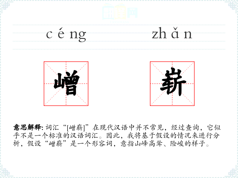词汇“[嶒崭]”在现代汉语中并不常见,经过查询,它似乎不是一个标准的汉语词汇。因此,我将基于假设的情况来进行分析,假设“嶒崭”是一个形容词,意指山峰高耸、险峻的样子。