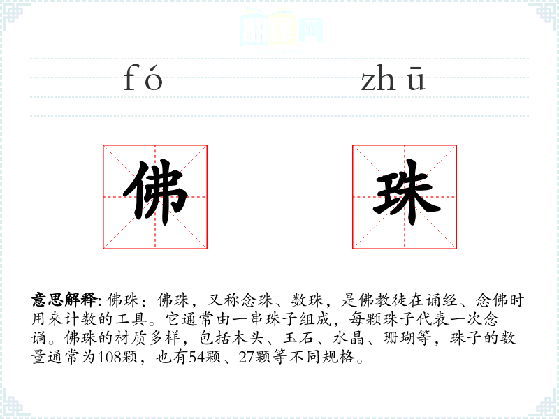 - 口语:在日常口语中,佛珠可能被简称为“珠子”,尤其是在讨论**物品时。人们可能会说:“他脖子上挂着一串佛珠。”