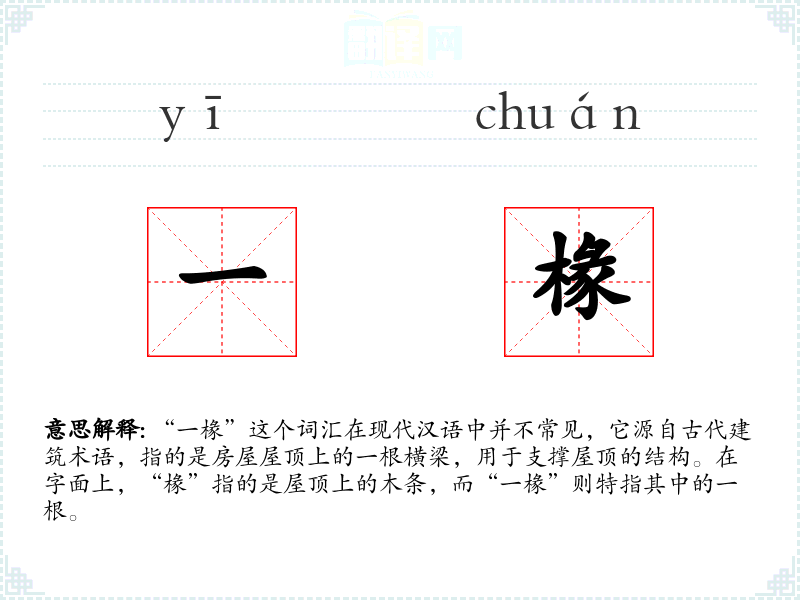 “一椽”这个词汇在现代汉语中并不常见,它源自古代建筑术语,指的是房屋屋顶上的一根横梁,用于支撑屋顶的结构。在字面上,“椽”指的是屋顶上的木条,而“一椽”则特指其中的一根。