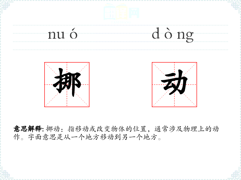 挪动:指移动或改变物体的位置,通常涉及物理上的动作。字面意思是从一个地方移动到另一个地方。