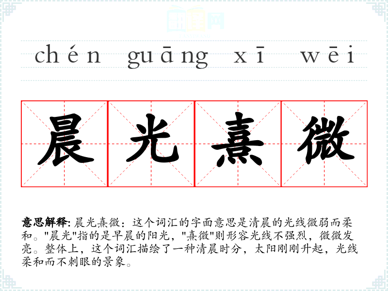 晨光熹微:这个词汇的字面意思是清晨的光线微弱而柔和。"晨光"指的是早晨的阳光,"熹微"则形容光线不强烈,微微发亮。整体上,这个词汇描绘了一种清晨时分,太阳刚刚升起,光线柔和而不刺眼的景象。