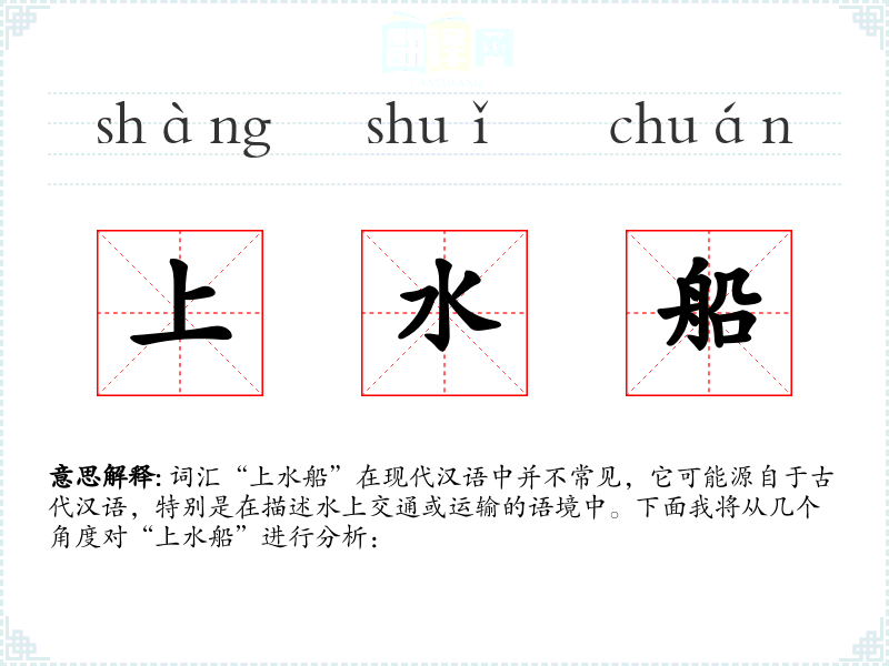词汇“上水船”在现代汉语中并不常见,它可能源自于古代汉语,特别是在描述水上交通或运输的语境中。下面我将从几个角度对“上水船”进行分析: