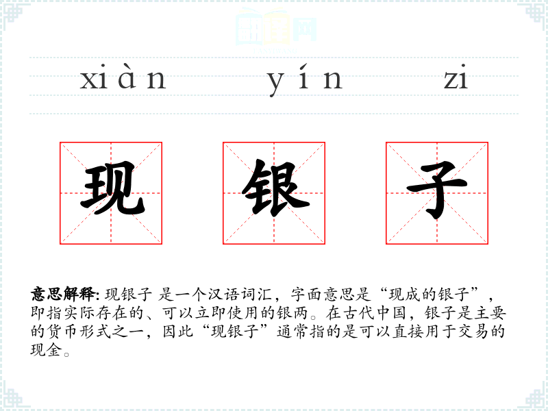 "现银子"的意思解释、现银子是什么意思由翻译网汉语词典查词提供。