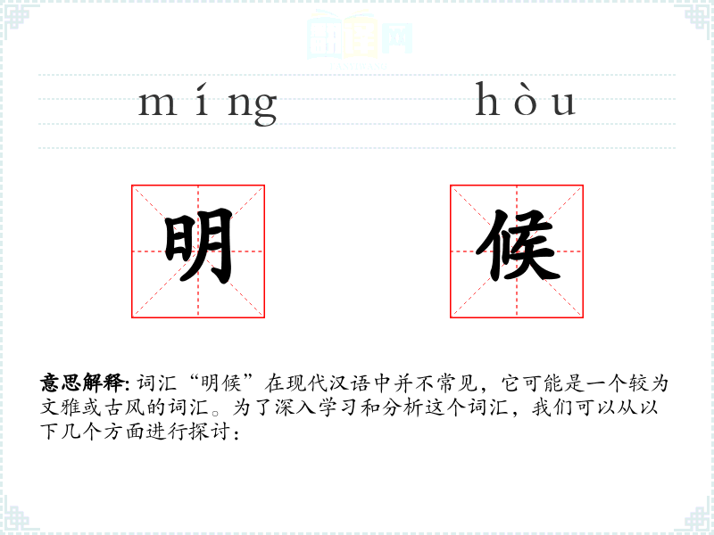 词汇“明候”在现代汉语中并不常见,它可能是一个较为文雅或古风的词汇。为了深入学*和分析这个词汇,我们可以从以下几个方面进行探讨: