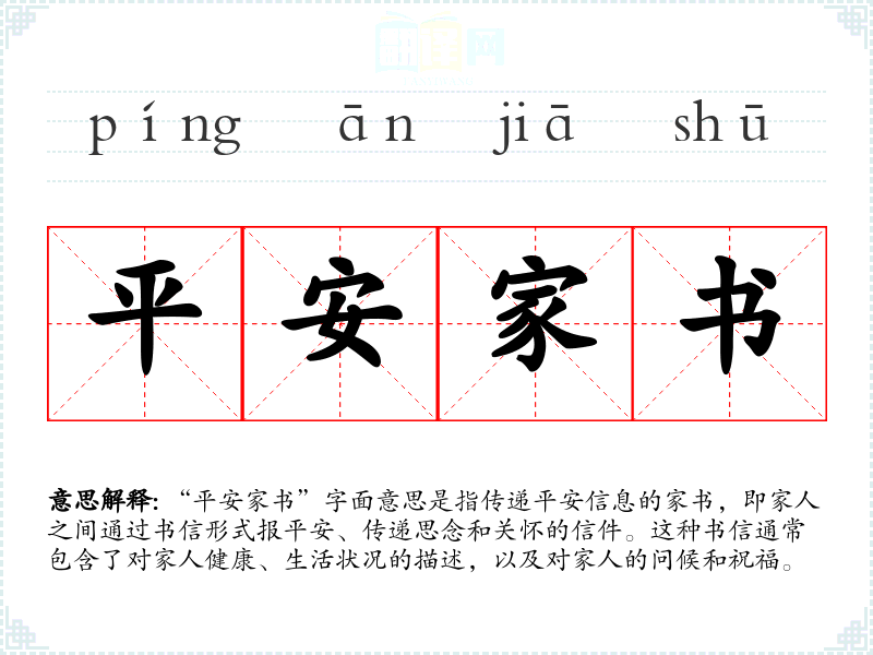 “平安家书”字面意思是指传递平安信息的家书,即家人之间通过书信形式报平安、传递思念和关怀的信件。这种书信通常包含了对家人健康、生活状况的描述,以及对家人的问候和祝福。