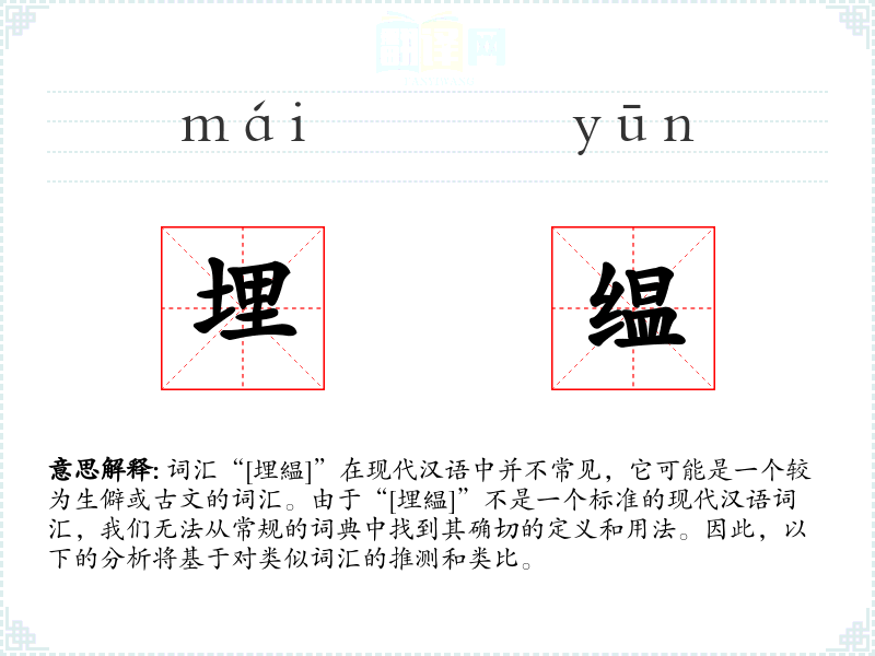 词汇“[埋緼]”在现代汉语中并不常见,它可能是一个较为生僻或古文的词汇。由于“[埋緼]”不是一个标准的现代汉语词汇,我们无法从常规的词典中找到其确切的定义和用法。因此,以下的分析将基于对类似词汇的推测和类比。