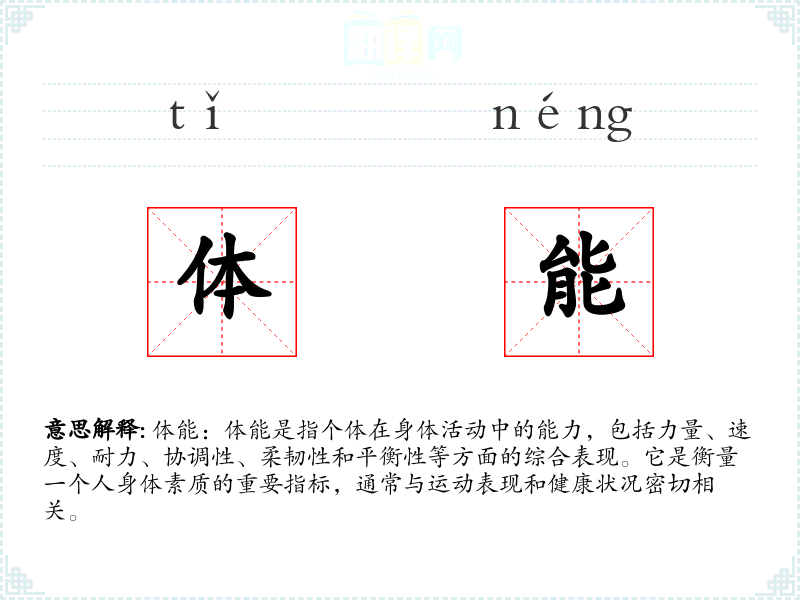 体能是一个多维度的概念,它不仅关乎*表现,也是健康和幸福生活的重要组成部分。在语言学和表达中,理解和运用这一词汇有助于更准确地描述和讨论与身体能力相关的话题。