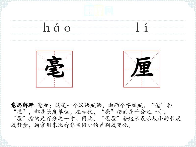 毫厘:这是一个汉语成语,由两个字组成,“毫”和“厘”,都是长度单位。在古代,“毫”指的是千分之一寸,“厘”指的是百分之一寸。因此,“毫厘”合起来表示极小的长度或数量,通常用来比喻非常微小的差别或变化。