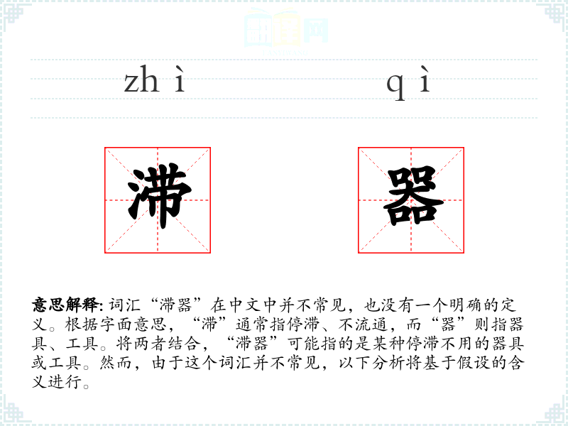 词汇“滞器”在中文中并不常见,也没有一个明确的定义。根据字面意思,“滞”通常指停滞、不流通,而“器”则指器具、工具。将两者结合,“滞器”可能指的是某种停滞不用的器具或工具。然而,由于这个词汇并不常见,以下分析将基于假设的含义进行。