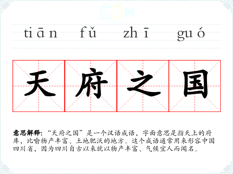 “天府之国”是一个汉语成语,字面意思是指天上的府库,比喻物产丰富、土地肥沃的地方。这个成语通常用来形容**四川省,因为四川自古以来就以物产丰富、气候宜人而闻名。