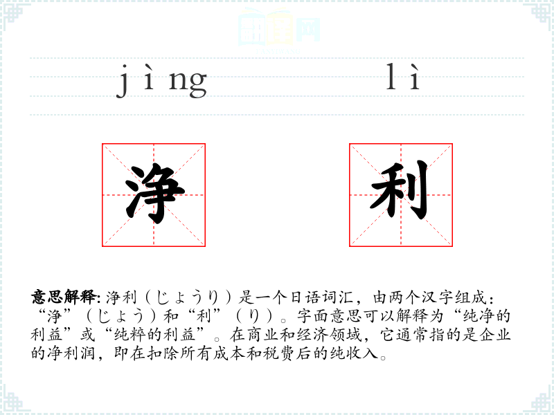“浄”字在日语中源自汉语,原意为清洁、纯净。在**中,“浄”也指净化心灵。“利”字则表示利益、好处。这两个字结合在一起,形成了“浄利”这个词汇,专门用于描述纯净的利益或净利润。
