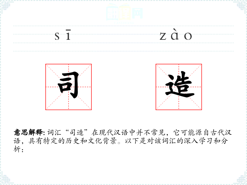 词汇“司造”在现代汉语中并不常见,它可能源自古代汉语,具有特定的历史和文化背景。以下是对该词汇的深入学*和分析: